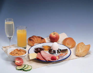 Jeder Gast bekommt ein reichhaltiges Frühstück, das im Zimmer, im Club- und Frühstücksraum oder bei schönem Wetter auf der Terasse eingenommen werden kann.